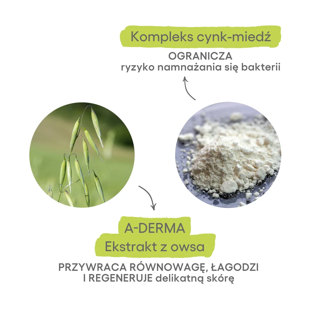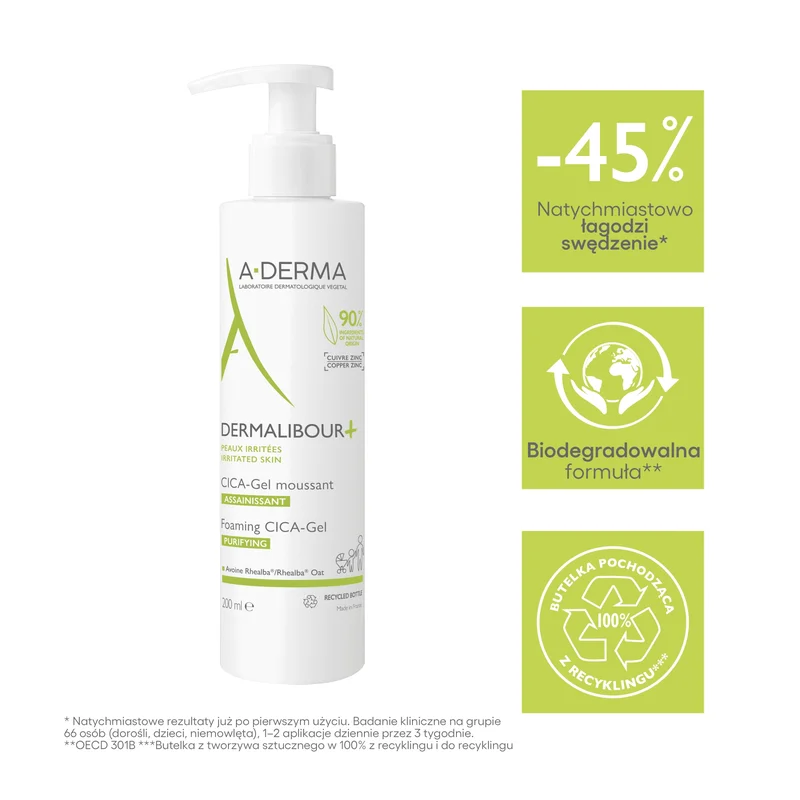 A-Derma Dermalibour + Cica Żel do mycia przeznaczony do oczyszczania podrażnionej skóry twarzy i ciała. Delikatnie myje, koi i oczyszcza podrażnione miejsca, dzięki ekstraktowi z młodych pędów owsa Rhealba® i połączeniu miedzi oraz cynku.Właściwości produktu