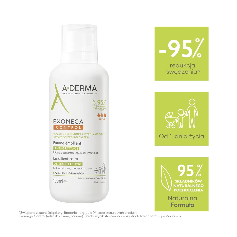 Balsam emolient A-Derma Exomega Control przeciw drapaniu łagodzi swędzenie i pomaga zmniejszyć częstotliwość występowania podrażnień, a jednocześnie zmniejsza zaczerwienienie suchej skóry ze skłonnością do egzemy atopowej. Jego kompleksowa skuteczność zmniejsza także suchość skóry, wzmacnia barierę skórną i pomaga przywrócić równowagę mikrobiomu. Odżywczy balsam o ultrabogatej, nieklejącej się konsystencji zapewnia potrójne działanie kojące już przy jednej aplikacji dziennie. Formuła oparta o ekstrakt z młodych pędów owsa Rhealba®, zawiera 95% składników pochodzenia naturalnego, nie zawiera substancji zapachowych i jest odpowiednia od 1. dnia życia. Codzienna, ukierunkowana, skuteczna i kojąca pielęgnacja, która uwzględnia delikatność suchej skóry z skłonnością do atopii, poprawiając jej codzienne funkcjonowanie.Stosowanie produktu
