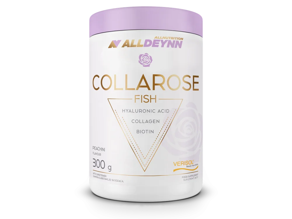 Allnutrition Alldeynn Collarose Fish Peachini to suplement diety, który zawiera składniki wspierające organizm w utrzymaniu równowagi. Zawiera kolagen, kwas hialuronowy oraz witaminy, które mogą wspomagać kondycję skóry oraz stawów. Produkt jest źródłem protein, co może przyczynić się do prawidłowego funkcjonowania organizmu. Suplement ma przyjemny smak brzoskwini, co ułatwia jego spożycie.Składniki