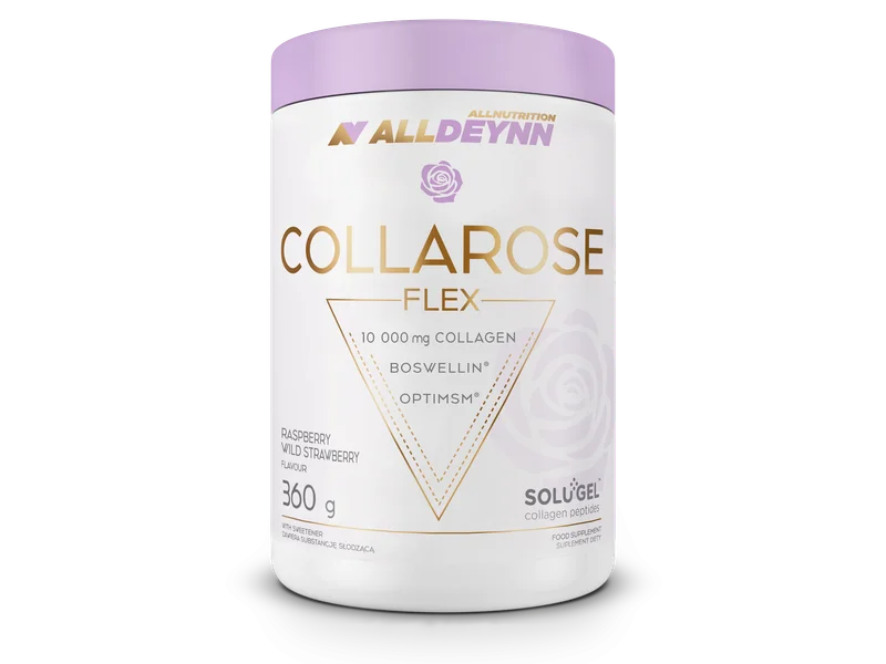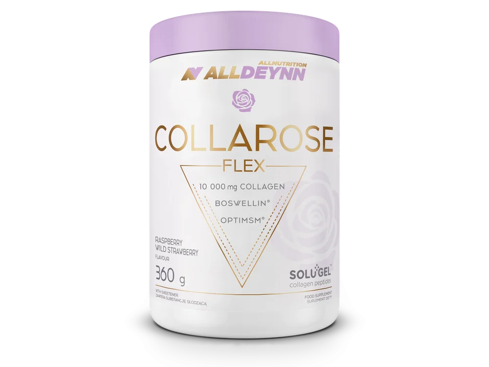 Allnutrition Alldeynn Collarose Flex Raspberry - Wild Strawberry to suplement diety, którego składniki wspierają prawidłowe funkcjonowanie stawów oraz elastyczność tkanek. Produkt zawiera wyciągi roślinne oraz inne substancje aktywne, które mogą być pomocne w utrzymaniu odpowiedniej kondycji układu ruchu. Suplement jest dostępny w formie proszku, który można łatwo dodać do napojów. Produkt przeznaczony dla osób dorosłych.