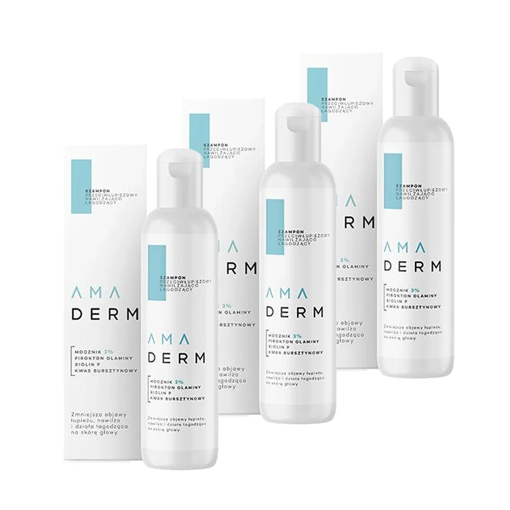 Szampon przeciwłupieżowy nawilżająco-łagodzący Amaderm to łagodny kosmetyk myjący o działaniu przeciwłupieżowym, przeznaczony do stosowania przy: łupieżu o różnym pochodzeniu zarówno suchym, jak i tłustym, atopowym zapaleniu skóry głowy, łojotokowym zapaleniu skóry głowy, łuszczycy skóry głowy, wspomagająco przy łupieżu pstrym. Dzięki odpowiednio dobranej kompozycji myjącej Szampon Amaderm sprawdzi się także w wypadku wyjątkowo delikatnej i wrażliwej skóry głowy. Preparat jest odpowiedni do stosowania już od 6 roku życia.Właściwości produktu