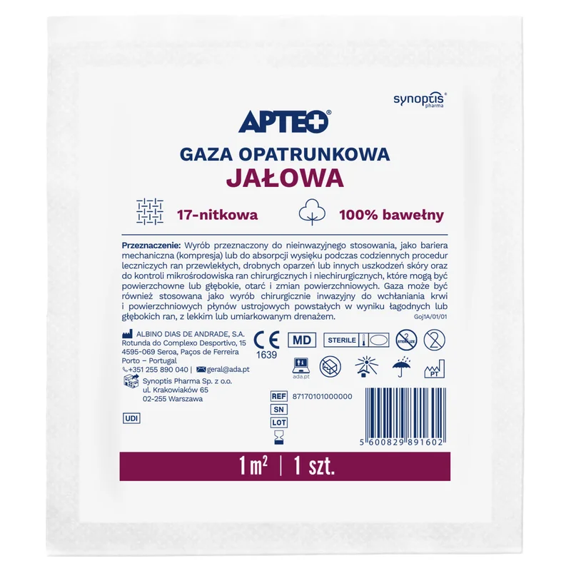APTEO Gaza opatrunkowa jałowa 1m² to wyrób medyczny przeznaczona do bezpośredniego opatrywania zranionej skóry, jako bariera mechaniczna, do ucisku lub absorbcji wysięków, a także jako wyrób chirurgiczny inwazyjny do krótkotrwałego użytku.Stosowanie produktu