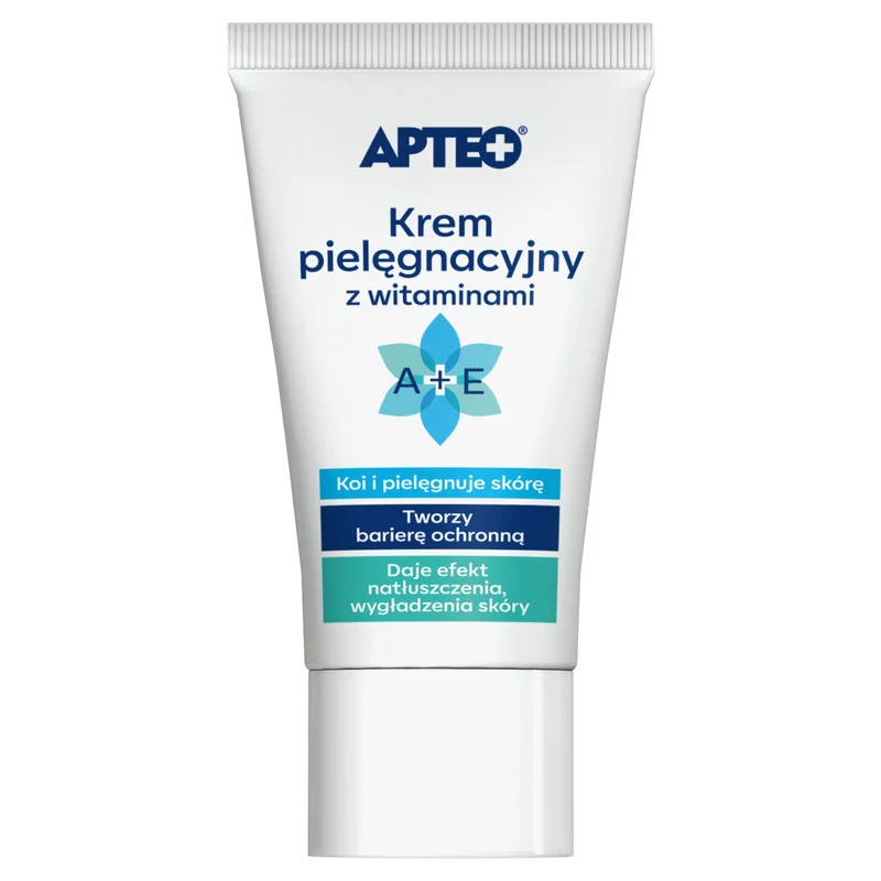 APTEO CARE Krem pielęgnacyjny z wit. A+E to produkt kosmetyczny. Zawiera witaminę A i E, które wspierają regenerację skóry. Produkt ma na celu nawilżenie i odżywienie naskórka, wspomagając jego naturalne funkcje. Krem przeznaczony jest do pielęgnacji skóry suchej i wrażliwej, zapewniając jej właściwe nawilżenie. Aplikacja preparatu może wpłynąć na poprawę kondycji skóry oraz jej elastyczność. Krem można stosować na dzień i na noc.Składniki/Ingredients