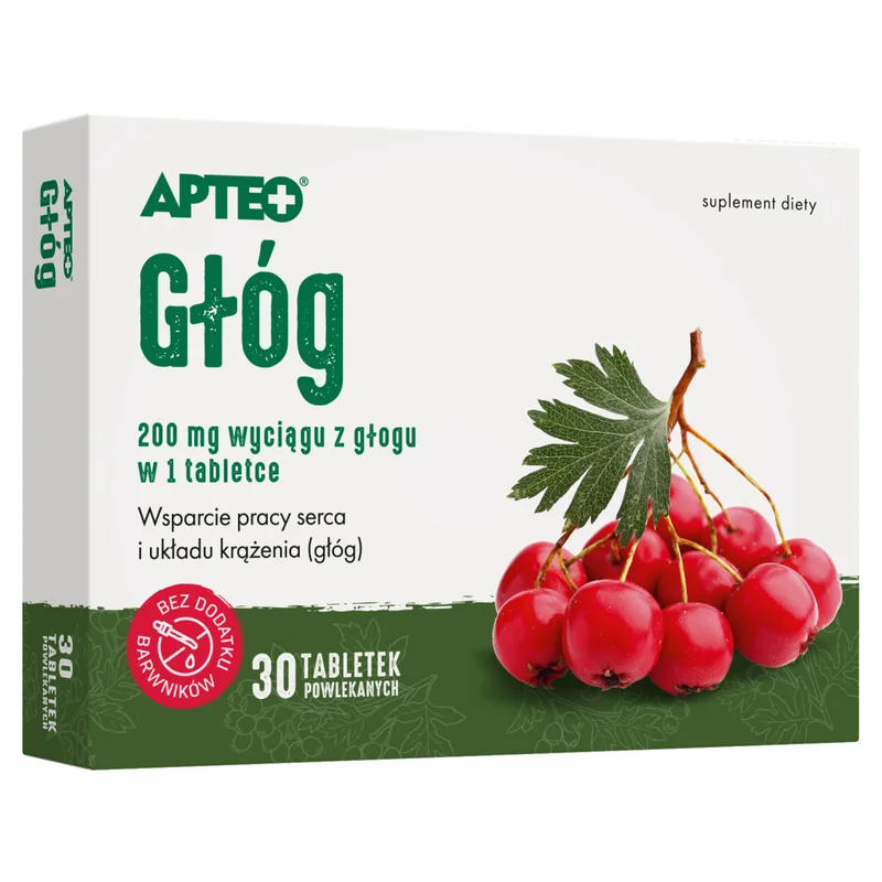 Apteo Głóg to suplement diety, który zawiera składniki wspierające prawidłowe funkcjonowanie serca oraz układu krążenia. Głóg jest znany z właściwości, które mogą wspomagać utrzymanie normalnej pracy mięśnia sercowego. Dodatkowo, składniki suplementu odpowiadają za regulację parametrów ciśnienia krwi, co może przyczynić się do ogólnej równowagi organizmu. Produkt jest przeznaczony dla osób poszukujących naturalnych komponentów w diecie.Składniki