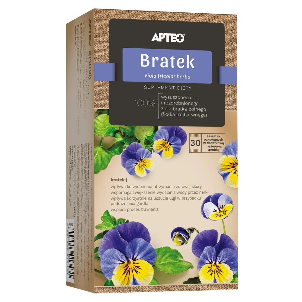 APTEO NATURA BRATEK FIX to środek spożywczy zawierający zioło bratka. Produkt dostępny jest w formie saszetek, które można zaparzać. Składniki zawarte w produkcie są naturalnego pochodzenia. Do przygotowania naparu należy wykorzystać wrzącą wodę. Bratek jest tradycyjnie stosowany w różnych formach w kuchni i herbaciarniach. Produkt może być używany jako dodatek do diety, w zależności od indywidualnych upodobań.Składniki