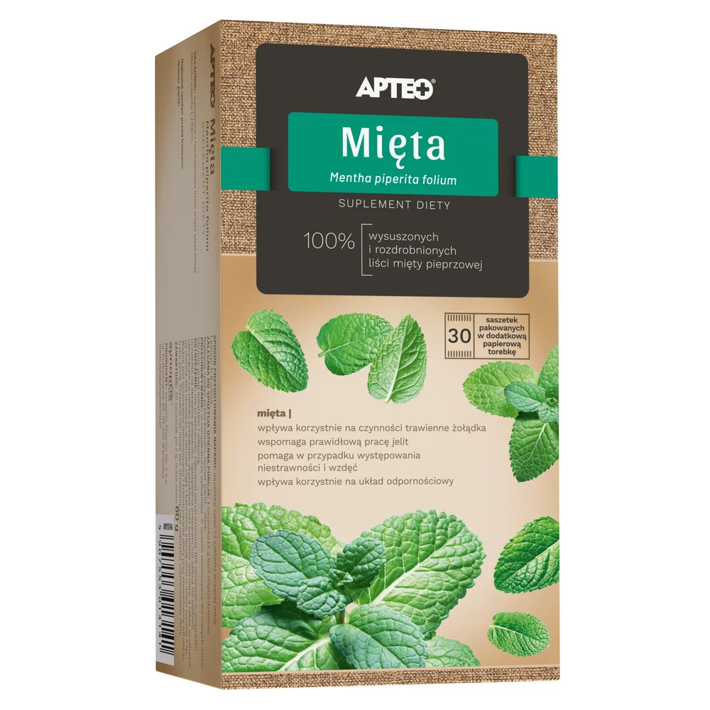 Apteo Natura Fix Mięta to saszetki pozwalające na przygotowanie naparu z mięty. Napar z liści mięty wykazuje pozytywny wpływ na czynności trawienne żołądka oraz na prawidłową pracę jelit. Poprawia apetyt, stymuluje czynności trawienne żołądka i perystaltykę jelit oraz działa łagodząco w przypadku niestrawności i wzdęć.Zalecane dzienne spożycie