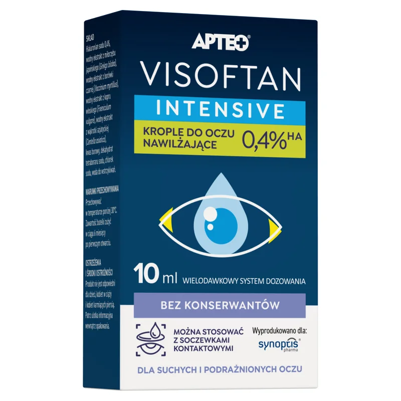 Apteo, Visoftan Intensive to wyrób medyczny stosowany w celu nawilżenia i łagodzenia objawów suchości oczu. Preparat jest przeznaczony do stosowania w przypadku podrażnień oka, które mogą być spowodowane czynnikami zewnętrznymi, jak długotrwała praca przed ekranem czy zanieczyszczone środowisko. Można go stosować w przypadku noszenia soczewek kontaktowych. Produkt nie zawiera konserwantów, co zmniejsza ryzyko wystąpienia reakcji alergicznych.Ostrzeżenia i środki ostrożności