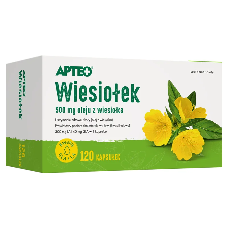Apteo Wiesiołek to suplement diety, którego składniki wspierają prawidłowy przebieg procesów metabolicznych oraz dostarczają nienasyconych kwasów tłuszczowych, w tym kwasu gamma-linolenowego (GLA). Suplement może być stosowany w ramach zrównoważonej diety. Zawiera naturalne składniki, które pomagają w utrzymaniu prawidłowej równowagi substancji odżywczych w organizmie.Składniki