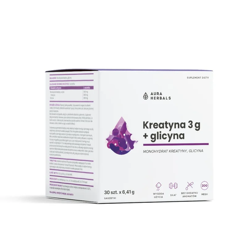 Aura Herbals Kreatyna 3 g to suplement diety dostępny w saszetkach. Jego składniki wspierają procesy energetyczne organizmu oraz uczestniczą w syntezie białek. Przeznaczony dla osób dorosłych powyżej 55 lat.