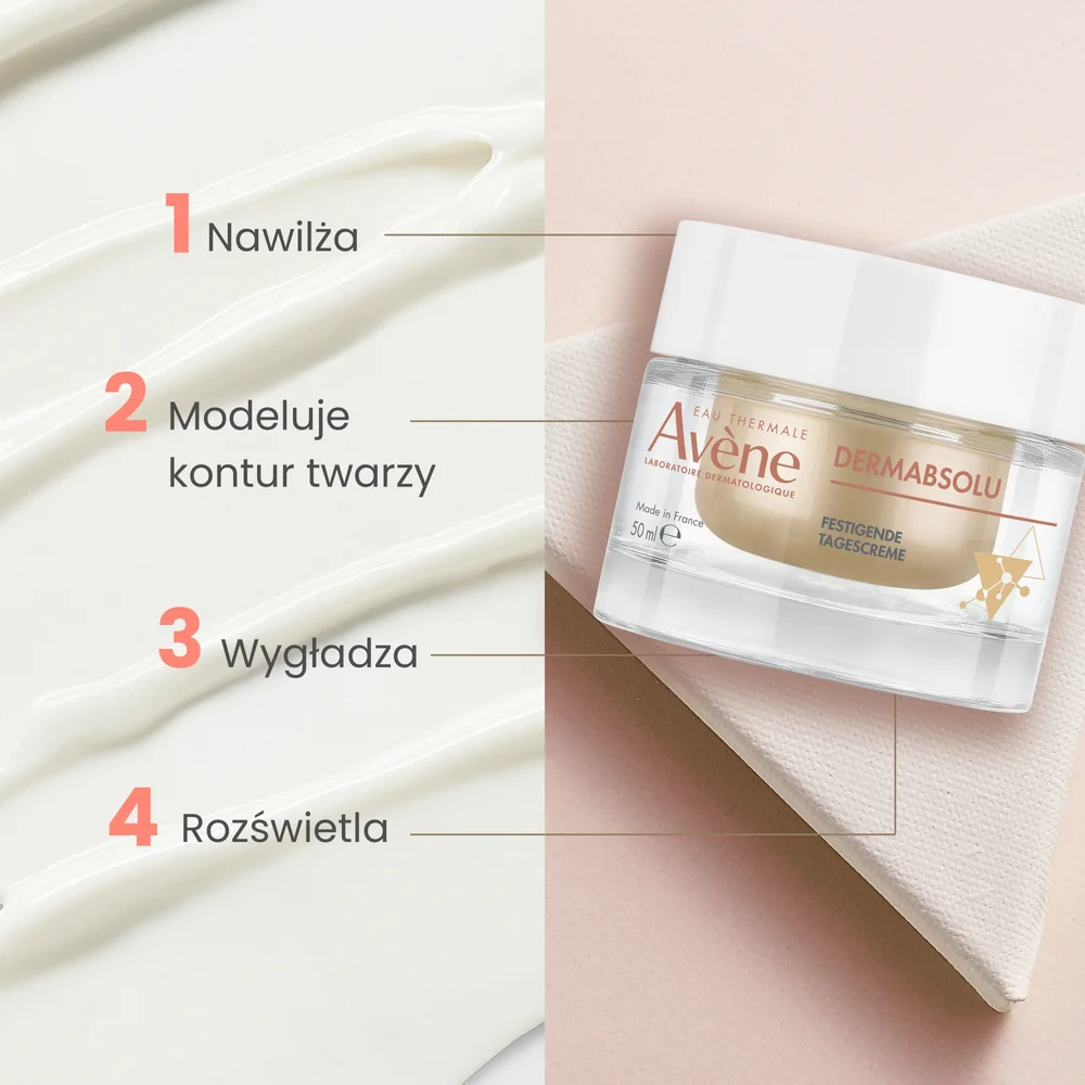 Avene Dermabsolu, Krem modelujący owal twarzy na dzień to produkt kosmetyczny opracowany dla skóry z oznakami starzenia. Odpowiedni również dla cery wrażliwej.