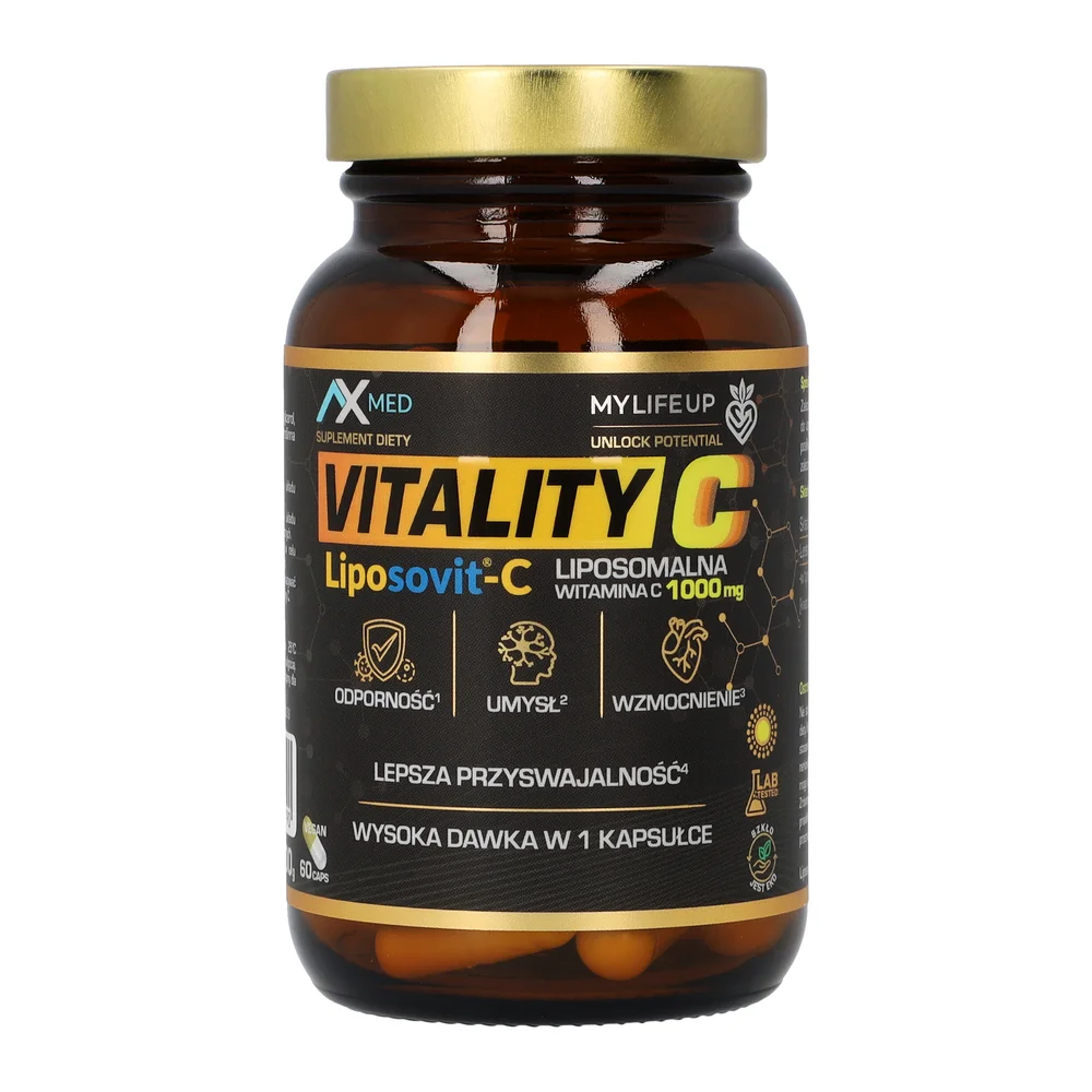 Ax Med Vitality C to suplement diety w formie kapsułek, zawierający witaminę C. Produkt przeznaczony dla osób dosłych.
