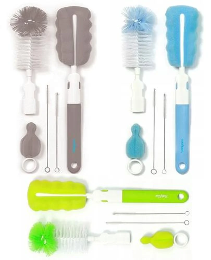 W zestawie znajdują się dwie wymienne końcówki do mycia butelek - jedna z miękkim włosiem, druga z elastyczną gąbką, które można swobodnie zamieniać w zależności od potrzeb. Dodatkowo dołączona jest mniejsza szczotka przeznaczona do czyszczenia smoczków. Ergonomiczna rączka zapewnia stabilny chwyt podczas użytkowania, a specjalny otwór umożliwia zawieszenie szczotki, co sprzyja jej szybkiemu wysychaniu.
