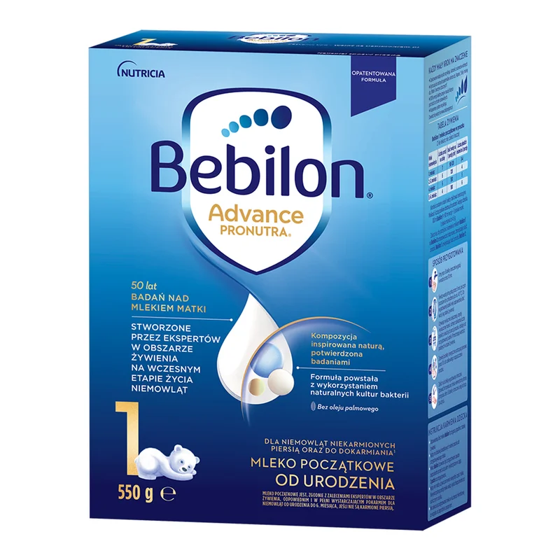 Bebilon Advance Pronutra 1 – środek spożywczy specjalnego przeznaczenia żywieniowego to mleko początkowe w proszku dla niemowląt od urodzenia, które nie są karmione piersią lub wymagają dokarmiania, o kompletnej formule inspirowanej badaniami nad mlekiem matki, wzbogacone w naturalne kultury bakterii i pozbawione oleju palmowego.