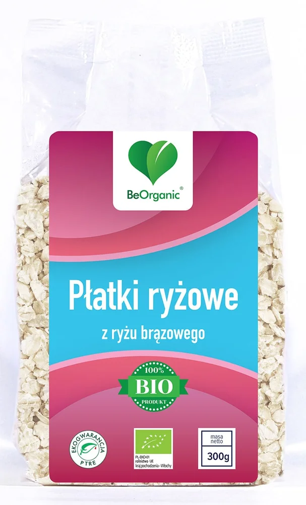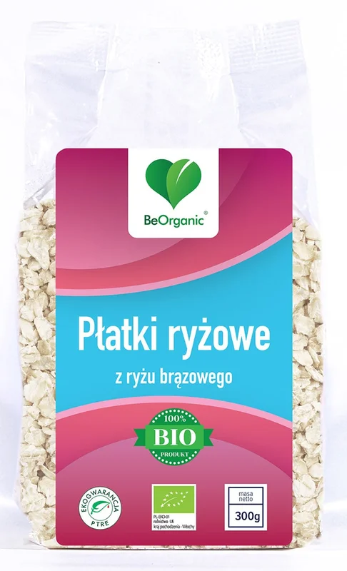 BeOrganic, Płatki ryżowe Eko to środek spożywczy składający się z ekologicznego ryżu, który został przetworzony na płatki. Produkt nie zawiera dodatku cukrów ani substancji chemicznych. Płatki ryżowe mogą być stosowane jako składnik potraw, dodatków lub w deserach. Idealnie sprawdzą się w zróżnicowanej diecie. Przechowywać w suchym miejscu.Składniki