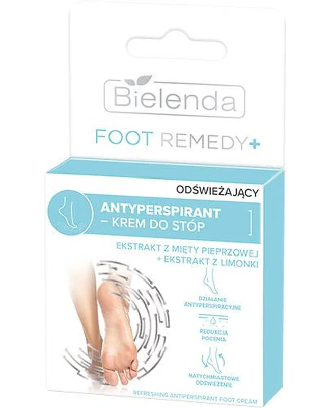 Odświeżający antyperspirant-krem do stóp BIELENDA FOOT REMEDY:odświeża skórę stóp, działa antyperspiracyjnie, neutralizując nieprzyjemny zapach,pozostawia skórę gładką i nawilżoną,daje uczucie świeżości i przywraca komfort,posiada lekką formułę, która błyskawicznie się wchłania i pozwala na swobodne stosowanie produktu nawet bezpośrednio przed założeniem obuwia oraz w ciągu dnia,zawiera ekstrakt z mięty pieprzowej, która odświeża oraz ekstrakt z limonki o działaniu orzeźwiającym i detoksykującym,jest skuteczny, wygodny w stosowaniu i działa już od 1 aplikacji.Stosowanie produktu