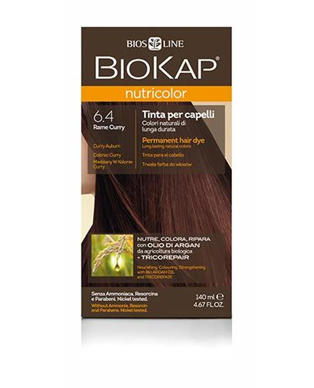BioKap Nutricolor Farba do włosów 6.4 Miedziany W Kolorze Curry to produkt kosmetyczny. Farba zawiera naturalne składniki, w tym ekstrakt z ziół i olejki roślinne, które pielęgnują włosy podczas koloryzacji. Produkt zapewnia intensywny kolor oraz długotrwały efekt. Jest wolny od amoniaku i substancji drażniących. BioKap Nutricolor jest przeznaczony do każdego rodzaju włosów. Formuła wspiera naturalny wzrost włosów, nadając im blask i zdrowy wygląd.Składniki/Ingredients