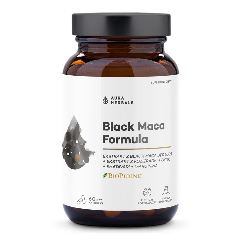 Black Maca Formula to suplement diety przeznaczony dla dorosłych, oparty na ekstrakcie z korzenia czarnej macy (100 mg, DER 100:1). Preparat został wzbogacony o ekstrakt z kozieradki pospolitej standaryzowany na 25% saponin, BioPerine® – markowy ekstrakt z czarnego pieprzu (95% piperyny), a także ekstrakt z shatavari, l-argininę i cynk.