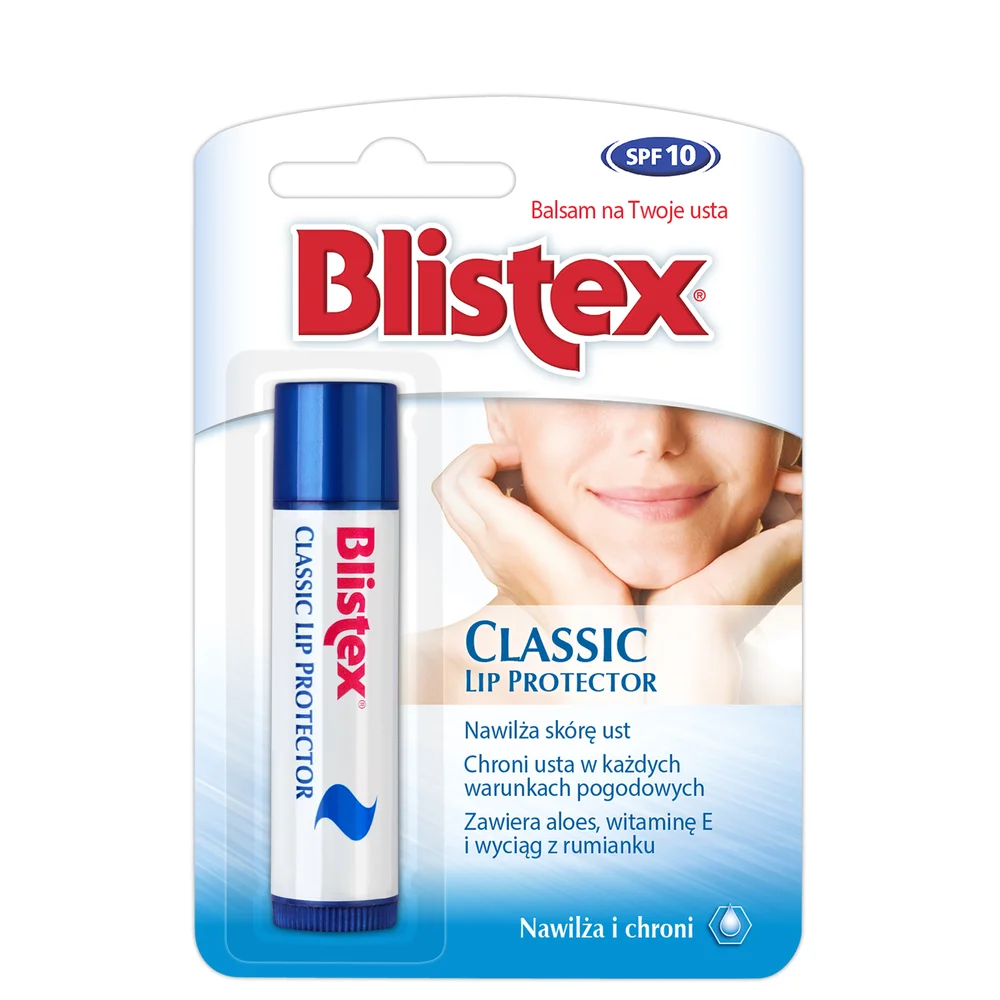 BLISTEX CLASSIC Balsam do ust skutecznie nawilża dzięki zawartości wyciągu z liści aloesu chroni usta w każdych warunkach pogodowych, szczególnie przed działaniem niskich temperatur, wiatru i słońca. Zabezpiecza usta przed przesuszeniem spowodowanym przebywaniem w klimatyzowanych pomieszczeniach; pielęgnuje skórę ust dzięki zawartości witaminy E i wyciągu z rumianku; zawiera filtr SPF 10, który chroni przed szkodliwym działaniem promieni UVB.Stosowanie produktu