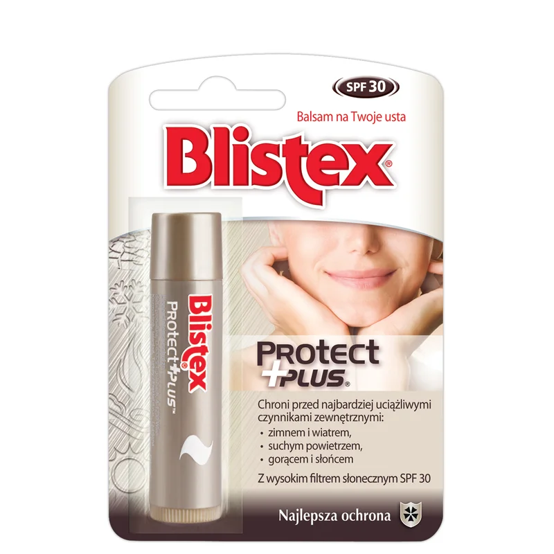 BLISTEX PROTECT PLUS Balsam do ust SPF 30 to produkt kosmetyczny, który chroni usta przed szkodliwym działaniem promieni UV. Zawiera filtr przeciwsłoneczny SPF 30, co zapewnia ochronę przed słońcem. Balsam nawilża i łagodzi spękania. Dzięki swojej formule, usta stają się miękkie i gładkie. Produkt idealny do stosowania na świeżym powietrzu oraz w warunkach wysokiego nasłonecznienia. Stosować w razie potrzeby, aby zapewnić ochronę i komfort.Właściwości produktu