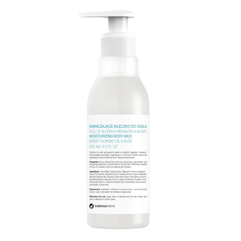 Botanicapharma mleczko do ciała z olejem ze słodkich migdałów i aloesem to kosmetyk przeznaczony do regularnej pielęgnacji skóry całego ciała. Jego formuła została opracowana tak, aby jednocześnie nawilżać, łagodzić i wspierać ochronę naskórka przed nadmierną utratą wilgoci. Dzięki temu dobrze sprawdza się w codziennym stosowaniu, zwłaszcza wtedy, gdy skóra staje się sucha, napięta lub mniej komfortowa w odczuciu.