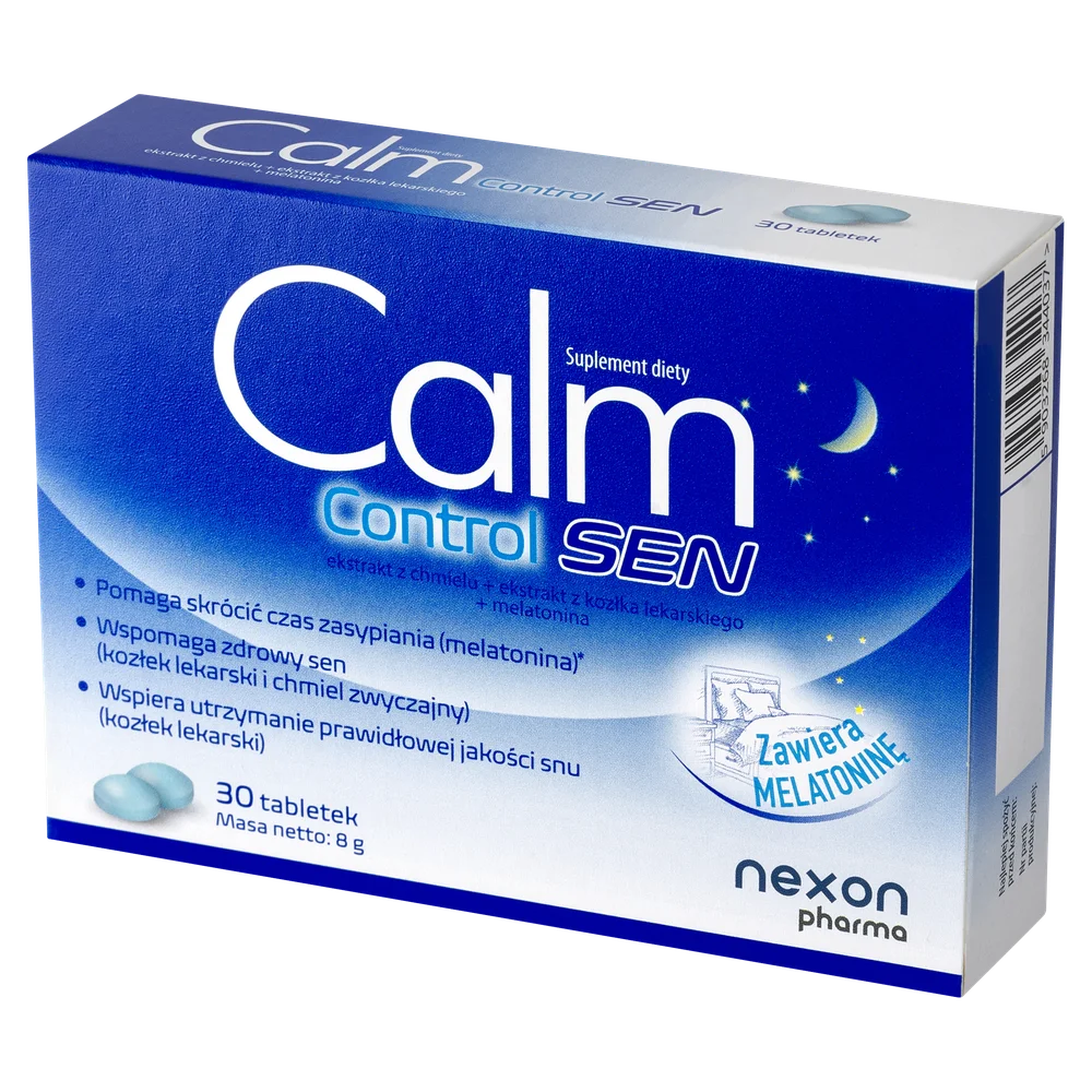 Calm Control Sen - suplement diety łączy melatoninę oraz naturalne ekstrakty roślinne, takie jak chmiel zwyczajny i kozłek lekarski (waleriana). Preparat został stworzony dla osób, które chcą poprawić komfort snu lub mają trudności z zasypianiem.
