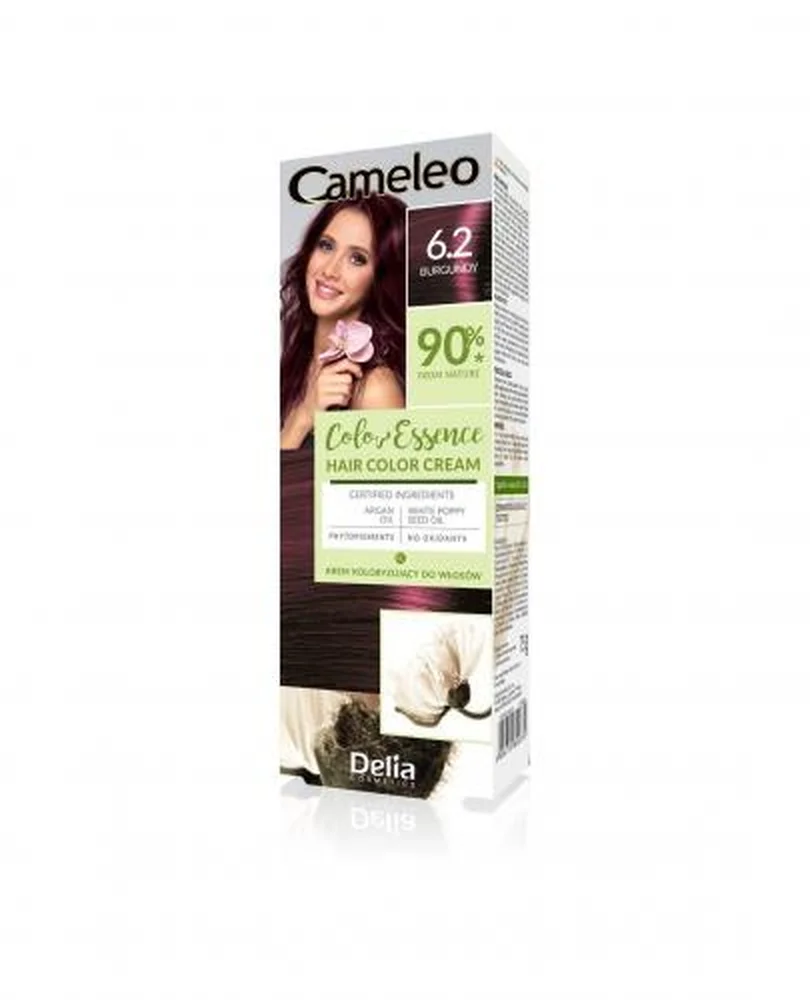 Cameleo Color Essence Krem koloryzujący 6.2 burgundy to produkt kosmetyczny, który zapewnia intensywne zabarwienie włosów w odcieniu burgbundowym. Formuła kremu ma na celu dbanie o kondycję włosów podczas koloryzacji. Produkt zawiera składniki pielęgnacyjne, które mają na celu nawilżenie włosów oraz ich ochronę. Dodatkowo, pozwala uzyskać trwały efekt koloryzacji, który uwydatnia naturalny blask. Informacje o zastosowaniu i czasie trwania koloryzacji znajdują się w ulotce dołączonej do opakowania.Składniki/Ingredients