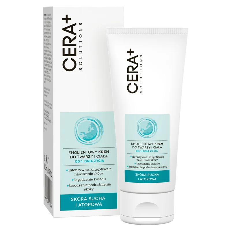 Cera+ Solutions emolientowy krem do twarzy i ciała dla dzieci 1. dnia życia to produkt kosmetyczny. Przeznaczony jest do pielęgnacji wrażliwej skóry dzieci od pierwszego dnia życia. Krem nawilża oraz chroni skórę przed przesuszeniem. Zawiera składniki, które wspierają naturalną barierę hydrolipidową. Produkt jest bezpieczny i hipoalergiczny. Idealny do codziennego stosowania, aby zadbać o delikatną skórę malucha.Składniki/Ingredients