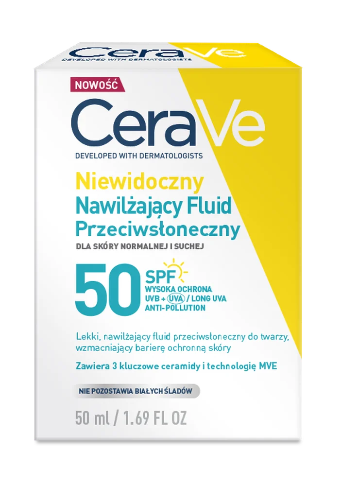 Cerave Sun, niewidoczny nawilżający fluid przeciwsłoneczny do skóry suchej SPF 50, 50 ml