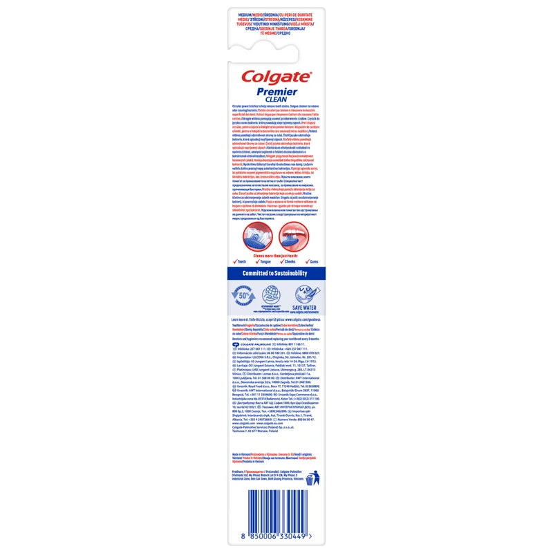 Colgate Szczoteczka do zębów Premier clean Średnia to produkt do codziennej higieny zębów i jamy ustnej.Szczoteczka do zębów o średniej twardości włosia z kolistymi włóknami, które pomagają usuwać przebarwienia. Rączka szczoteczki dopasowuje się do kształtu dłoni, zapewniając lepszą kontrolę ruchów podczas szczotkowania. Elastyczna szyjka zapewnia amortyzację nacisku chroniąc dziąsła przed podrażnieniami.Ostrzeżenia dotyczące bezpieczeństwa