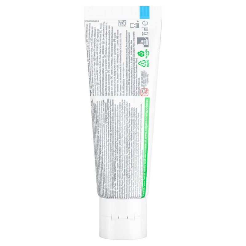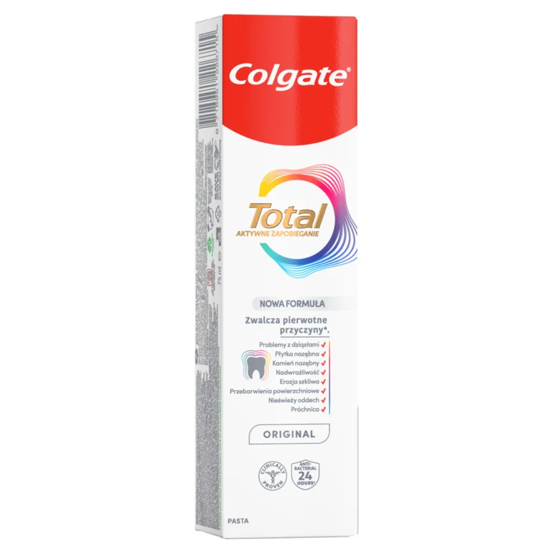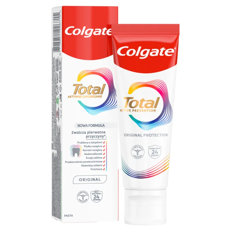 COLGATE Total Original pasta do zębów czyści całą jamę ustną i zapewnia udoskonaloną ochronę przed gromadzeniem się płytki nazębnej, zapaleniem dziąseł, nadwrażliwością, przebarwieniami, kamieniem nazębnym i ubytkami oraz przynosi nowe, dodatkowe korzyści – pomaga zwalczać bakterie w celu ochrony szkliwa oraz natychmiastowo neutralizuje zapachy związane z nieświeżym oddechem. Nowy, ulepszony smak pasty pozostawia w ustach uczucie czystości i świeżości. Zapewnia 12 godzinną ochronę przed bakteriami na zębach, języku, policzkach i dziąsłach.