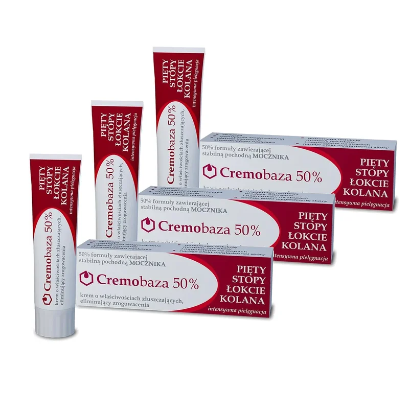 - Cremobaza 50% wspomaga złuszczanie martwego naskórka, ułatwiając odnowę skóry.