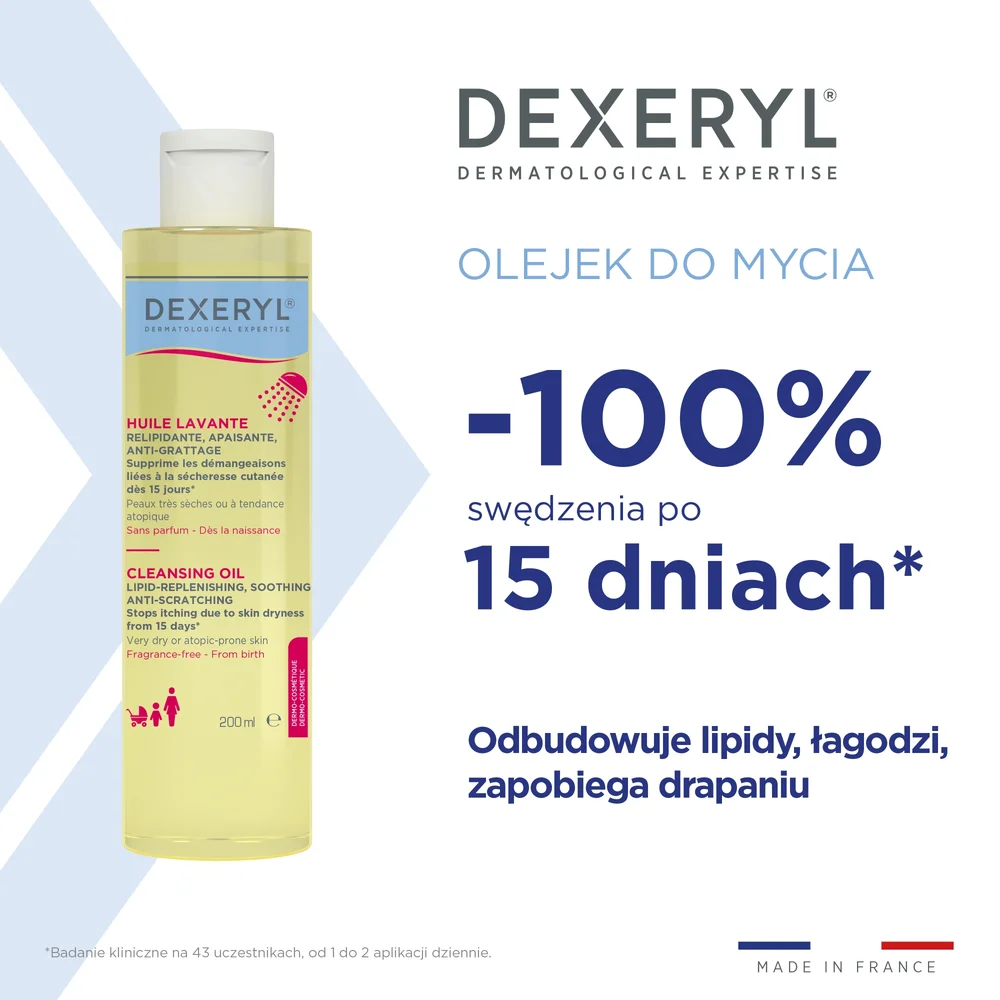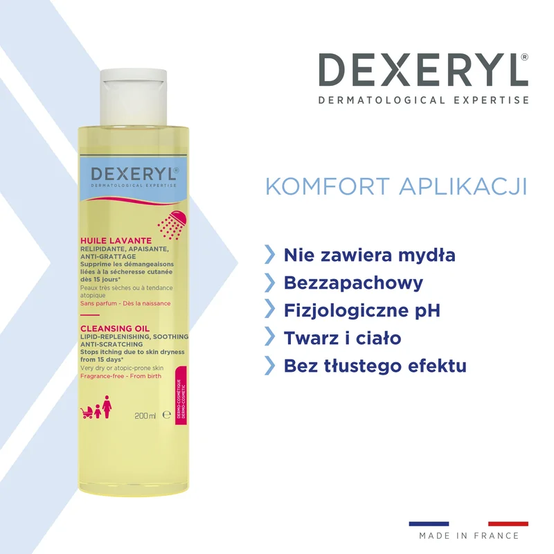 DEXERYL Olejek Oczyszczający do mycia w 100% eliminuje swędzenie już w 15 dni, nawilża skórę i przywraca jej witalność bez naruszania bariery ochronnej skóry. Płynna konsystencja jest przyjemna w aplikacji, na skórze tworzy lekką, miękką i łatwą do spłukania pianę. Bezzapachowa i pozbawiona mydła formuła jest odpowiednia dla noworodków. Nawilża i intensywnie odżywia skórę. Uzupełnia lipidy. Odpowiedni dla noworodków. Nie zawiera mydła. Nie podrażnia oczu. Łatwo się spłukuje.Stosowanie produktu