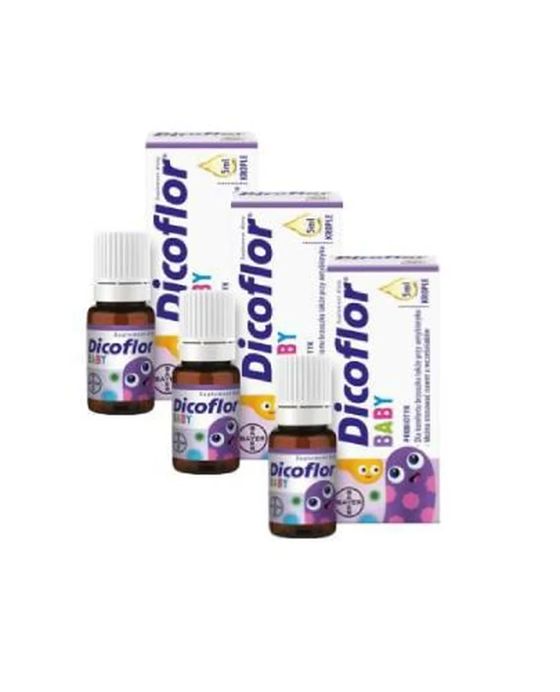 Dicoflor Baby probiotyk to suplement diety w postaci kropli, który zawiera liofilizowane żywe kultury bakterii Lactobacillus rhamnosus GG, a dzięki starannie dobranemu składowi wspiera równowagę mikroflory jelitowej oraz prawidłowe funkcjonowanie układu pokarmowego i może być stosowany zarówno przez niemowlęta i dzieci od 1. dnia życia, jak i przez osoby dorosłe, stanowiąc wygodne uzupełnienie codziennej diety.