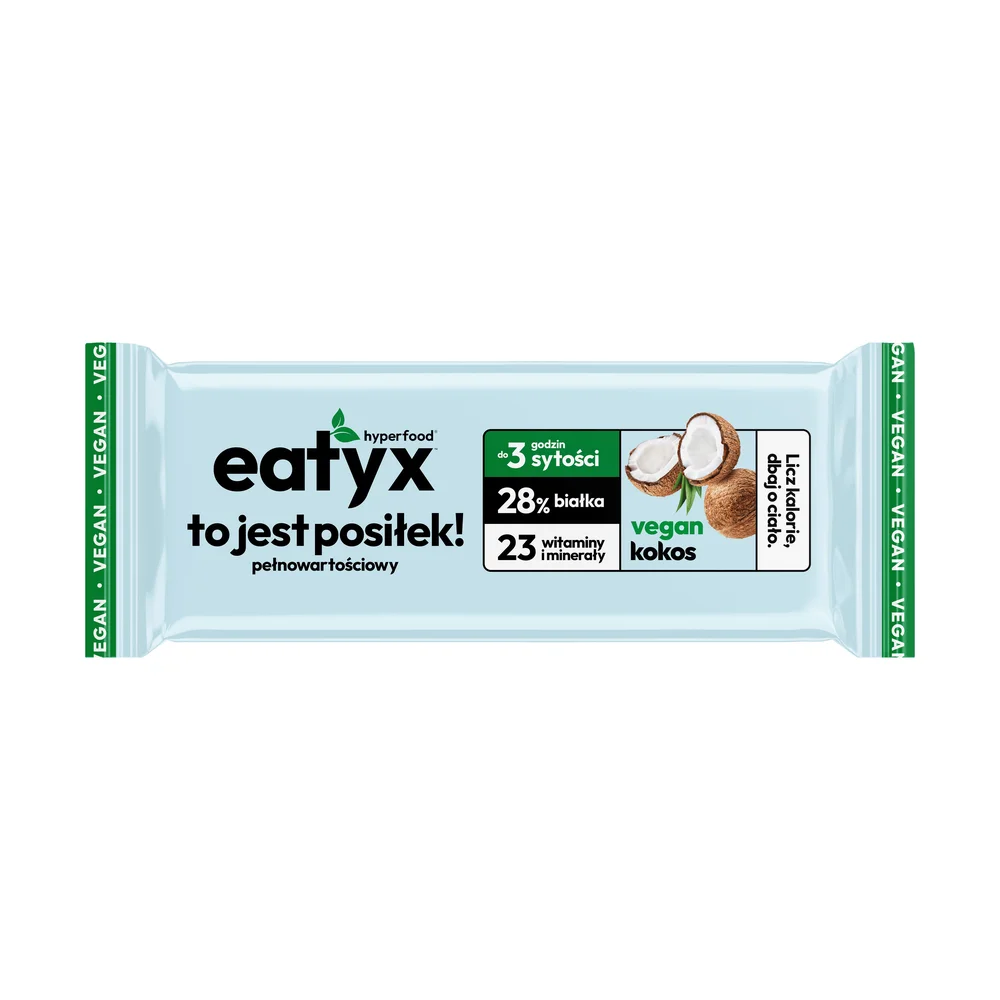 Eatyx Hyperfood - środek spożywczy stanowiący alternatywę dla klasycznego posiłku. Produkt to pełnowartościowy, wegański baton o smaku kokosowym stanowiący cenne źródło białka, błonnika, a także witamin i składników mineralnych. Sprawdzi się jako praktyczny posiłek wspierający utrzymanie prawidłowej masy ciała i kontrolę dziennego bilansu energetycznego.