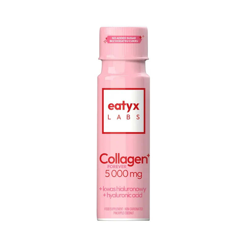 Eatyx Labs, Collagen Forever 5000 mg + Hialuron to suplement diety w formie shota o smaku ananasa i kokosa. Produkt w swoim składzie zawiera kolagen wołowy, kwas hialuronowy, a także witaminę C, biotynę i cynk. Składniki wspierają zdrowie i kondycję skóry, włosów i paznokci. Produkt przeznaczony dla osób dorosłych.
