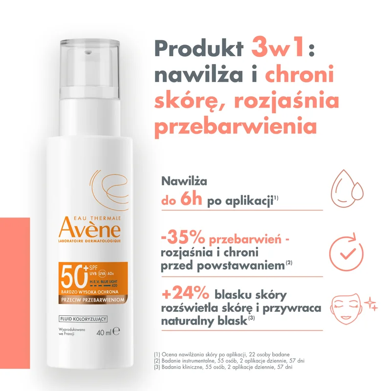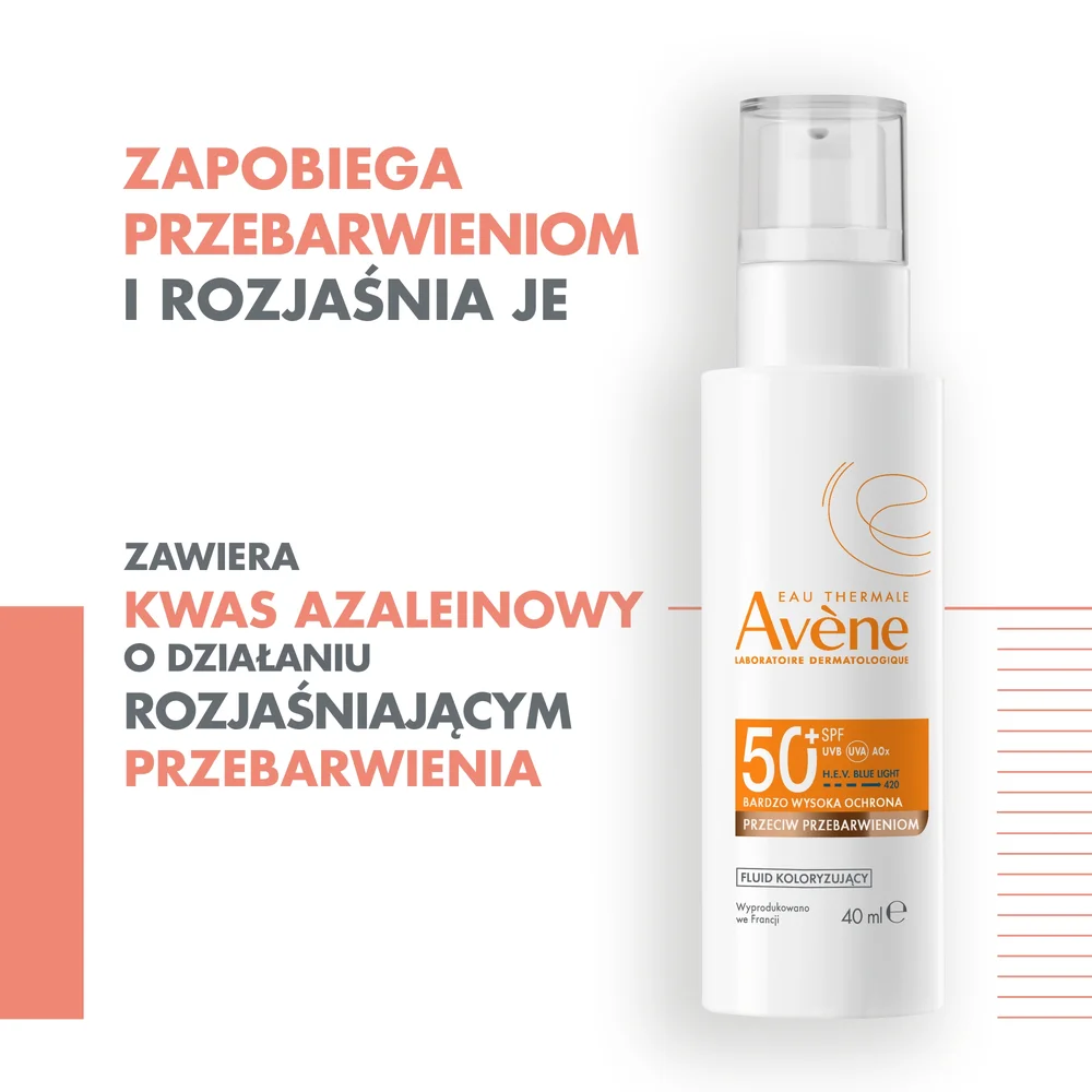 Avene, Fluid koloryzujący bardzo wysoka ochrona przeciw przebarwieniom SPF 50+ to produkt kosmetyczny, który zapewnia codzienną wysoką ochronę przed promieniowaniem UVB, UVA i niebieskim światłem HEV, aby zapobiegać pojawianiu się ciemnych plam wywołanych światłem. Odpowiedni dla skóry wrażliwej.