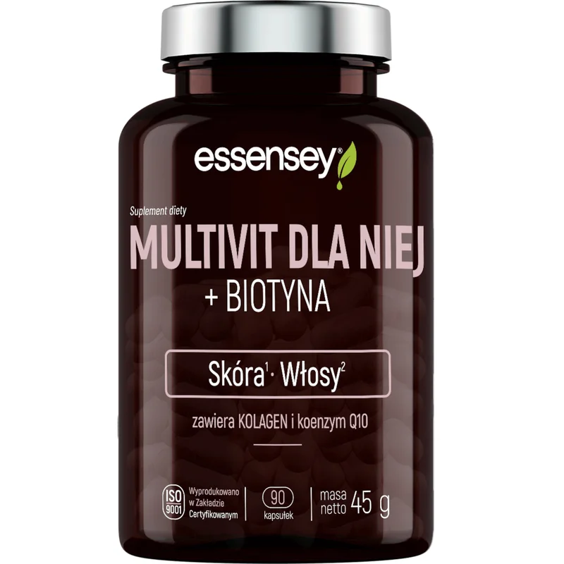 Essensey Multivit Dla Niej + Biotyna to suplement diety w kapsułkach opracowany dla dorosłych kobiet. Produkt w swoim skladzie zawiera witaminy i minerały, a także kolagen, ekstrakt z zielonej herbaty, CLA, L-karnitynę, kwas hialuronowy i koenzym Q10.
