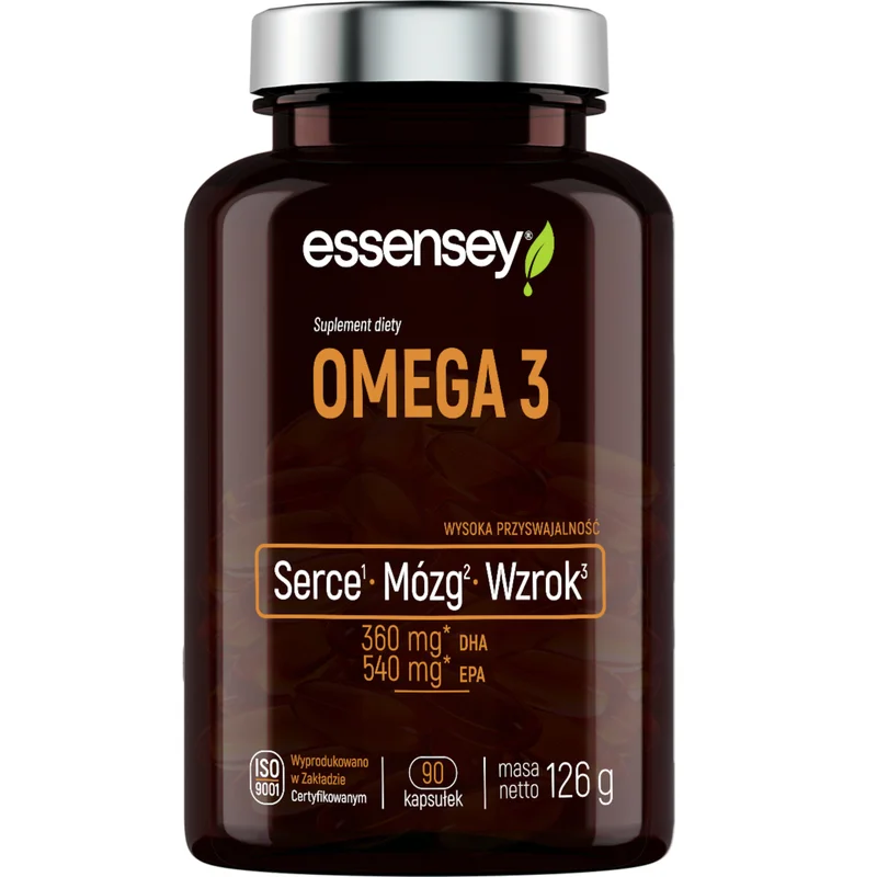Essensey Omega 3 to suplement diety zawierający wielonienasycone kwasy tłuszczowe EPA i DHA należące do grupy omega-3. Produkt przeznaczony dla osób dorosłych.
