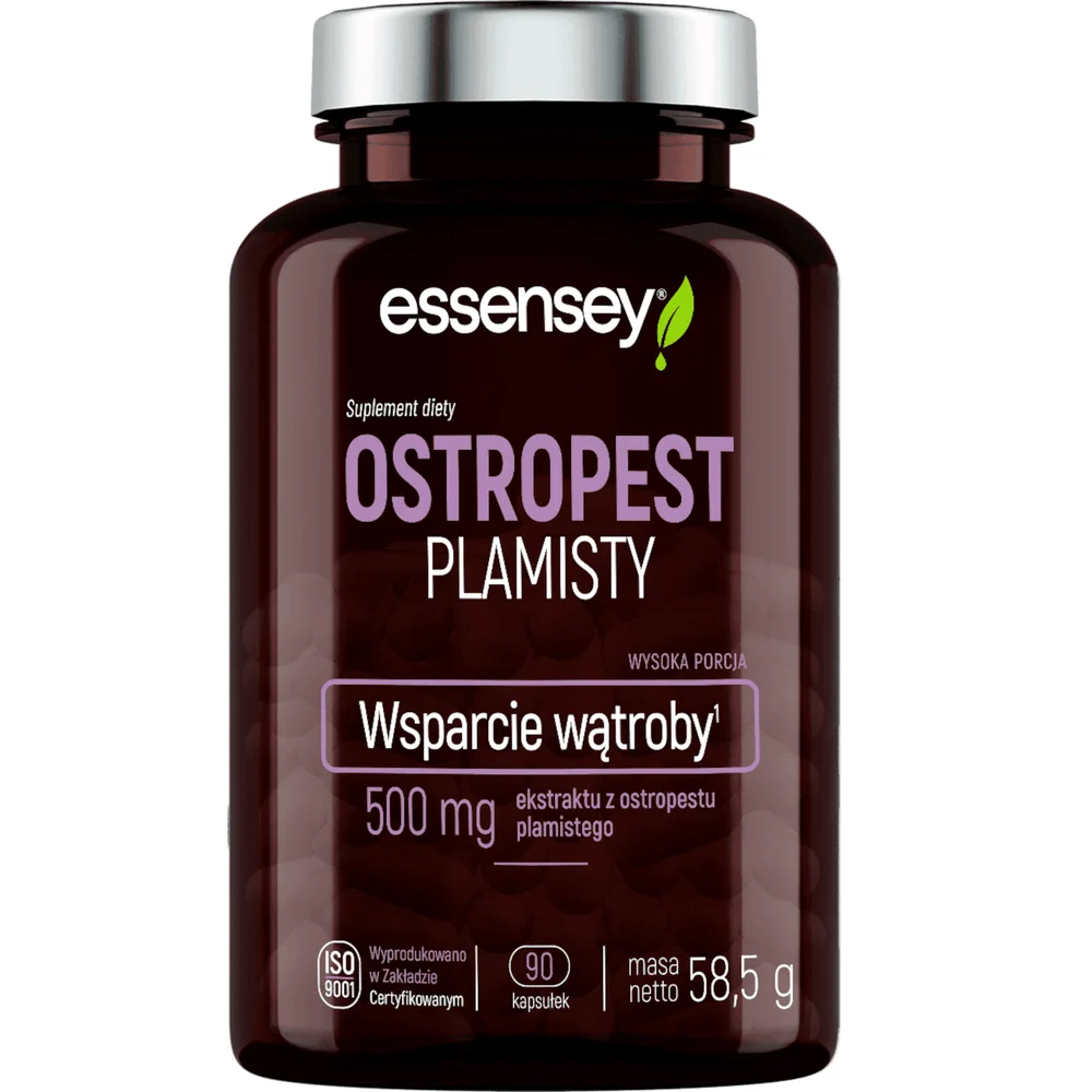Essensey Ostropest Plamisty to suplement diety w formie kapsułek, zawierający ekstrakt z nasion ostropestu plamistego (Silybum marianum). Produkt przeznaczony dla osób dorosłych.
