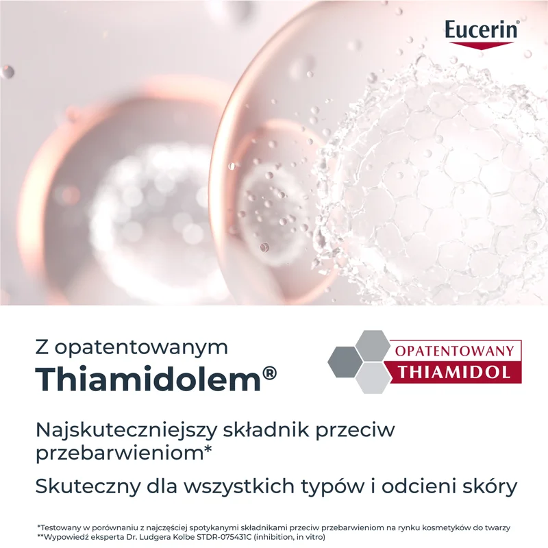 Właśnie dlatego krem na dzień działa dwutorowo. Z jednej strony zawiera Thiamidol – opatentowany składnik wspierający redukcję zmian pigmentacyjnych u źródła, z drugiej zapewnia ochronę przed promieniowaniem słonecznym, która jest kluczowa, jeśli celem jest ograniczenie powstawania nowych plam. Przy regularnym stosowaniu plamy stają się rozjaśnione, a koloryt staje się wyraźnie ujednolicony.