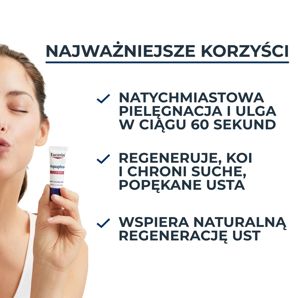 Eucerin Aquaphor to produkt kosmetyczny przeznaczony do pielęgnacji suchej i wrażliwej skóry. Formuła zawiera składniki, które wspierają regenerację skóry oraz łagodzą podrażnienia. Pomadka chroni usta przed niekorzystnym działaniem czynników zewnętrznych, zapewniając długotrwałe nawilżenie. Zastosowanie Eucerin Aquaphor jest odpowiednie dla osób z wrażliwą skórą oraz tych, które potrzebują wsparcia w codziennej pielęgnacji.Składniki/Ingredients