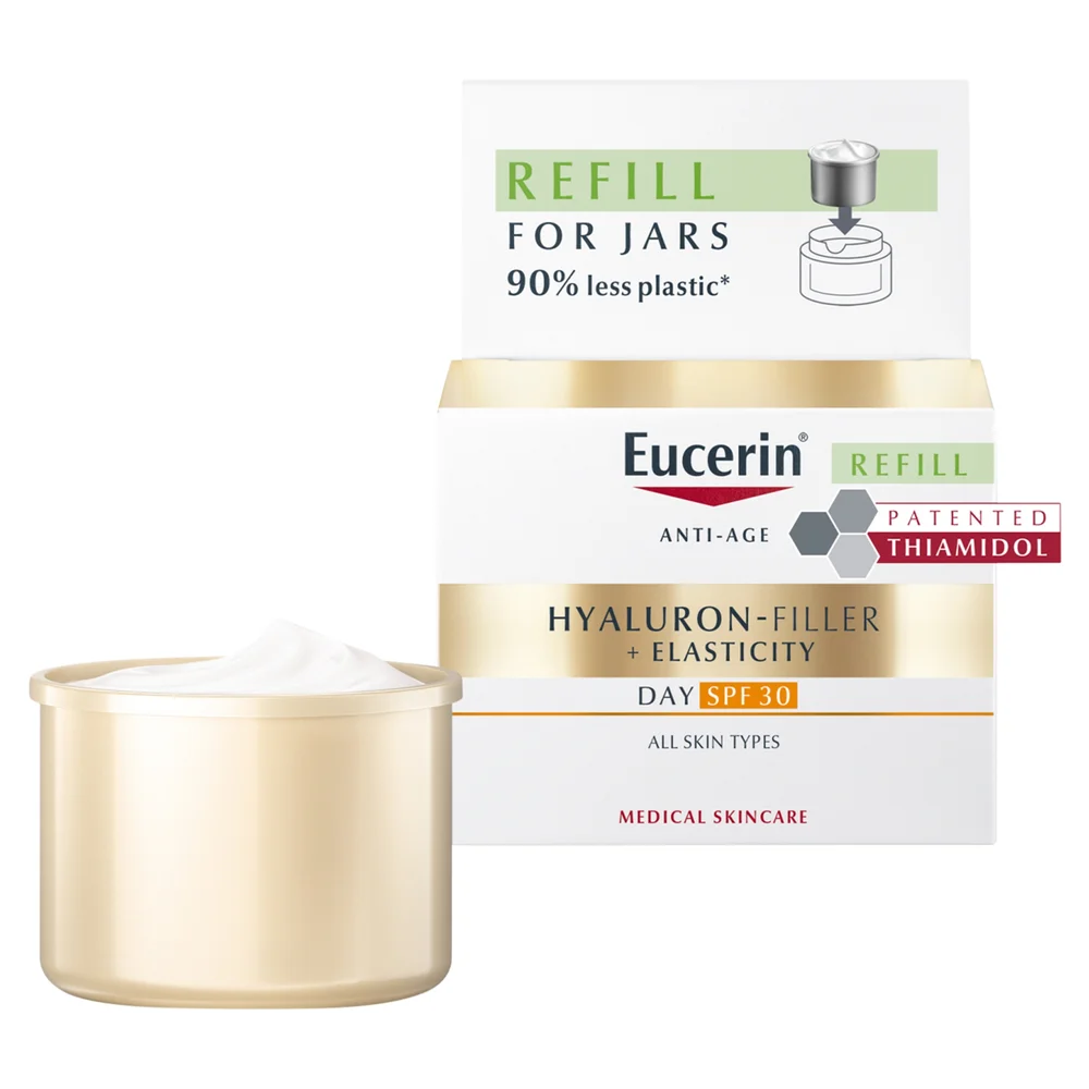 Eucerin Hyaluron-filler + elasticity krem na dzień SPF 30 refill - produkt kosmetyczny stanowiący nowoczesne rozwiązanie pielęgnacyjne dla skóry dojrzałej, z oznakami starzenia i przebarwieniami. Innowacyjna formuła łączy skuteczne działanie przeciwzmarszczkowe z ochroną przeciwsłoneczną.