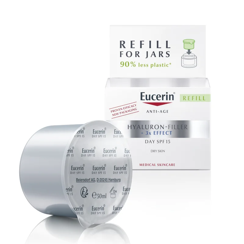 Produkt dostępny w formie wkładu uzupełniającego. Wkład zużywa aż o 90% mniej plastiku niż tradycyjny słoiczek kremu do twarzy Hyaluron-Filler. Jest kompatybilny ze wszystkimi słoiczkami kremów do twarzy Eucerin.