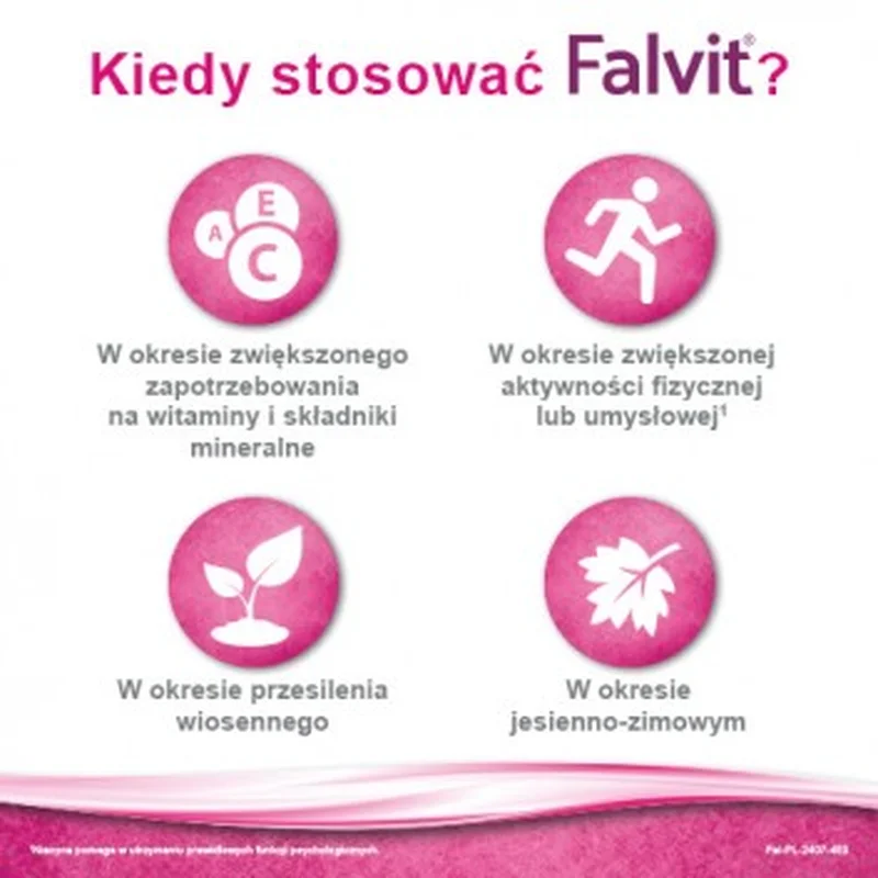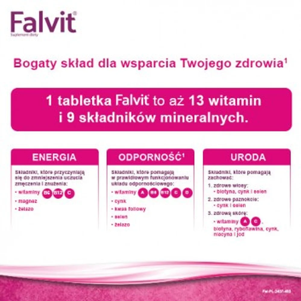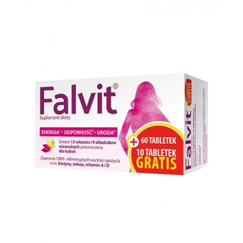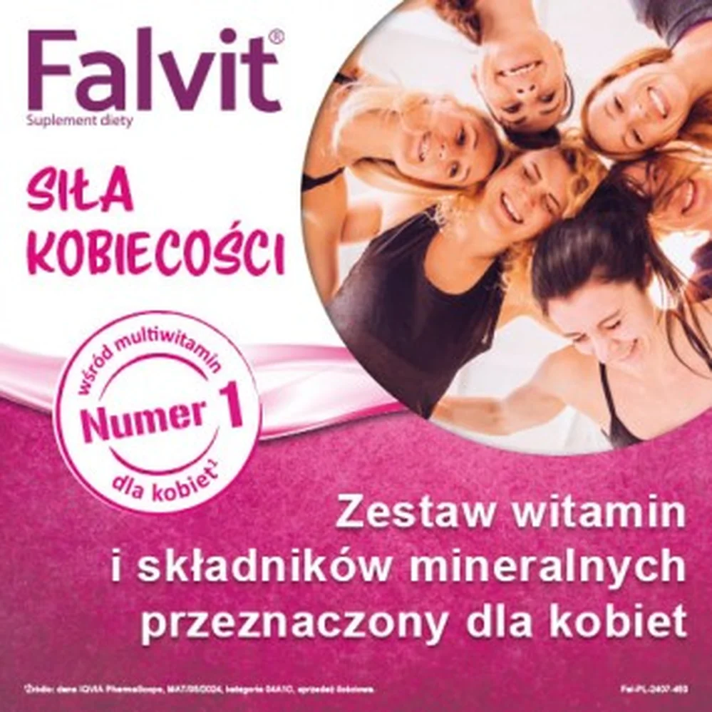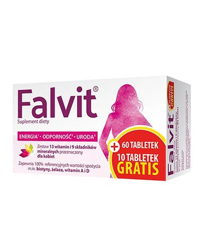 Falvit to suplement diety opracowany z myślą o kobietach, zawierający kompleks 13 witamin i 9 minerałów niezbędnych dla codziennego funkcjonowania organizmu.