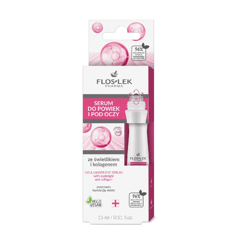 Flos-Lek Preparaty ze Świetlikiem, serum do powiek i pod oczy ze świetlikiem i kolagenem to produkt kosmetyczny, który łagodzi podrażnienia oraz zmniejsza opuchliznę okolic oczu. Działa nawilżająco i wygładzająco, a dzięki zawartości kolagenu wspiera elastyczność skóry. Serum jest przeznaczone do codziennej pielęgnacji delikatnej skóry powiek i okolicy oczu. Zaleca się stosowanie preparatu w celu poprawy wyglądu zmęczonej i opuchniętej skóry.Składniki/Ingredients