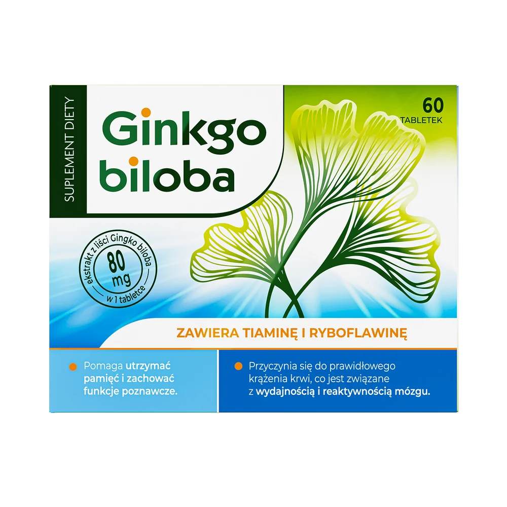 Ginkgo Biloba to suplement diety zawierający ekstrakt z liści miłorzębu japońskiego, a także ryboflawinę i tiaminę. Produkt dla osób dorosłych.