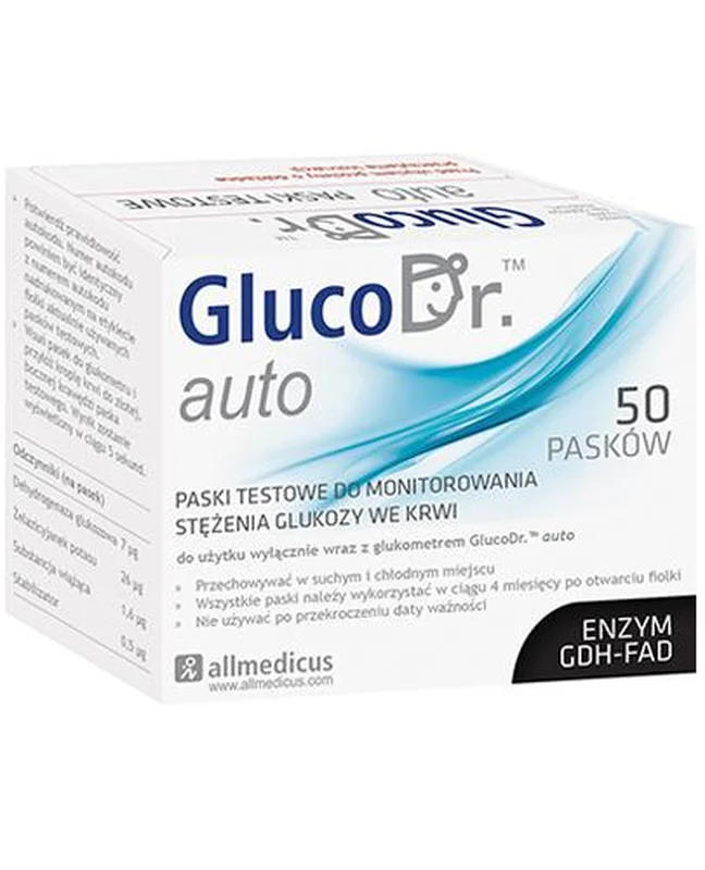 GlucoDr. auto A paski testowe to wyrób medyczny przeznaczony do pomiaru stężenia glukozy we krwi, do stosowania wraz z glukometrem GlucoDr. auto oraz GlucoDr. auto A. Produkt przeznaczony do użytku profesjonalnego oraz do samokontroli w warunkach domowych.Charakterystyka produktu