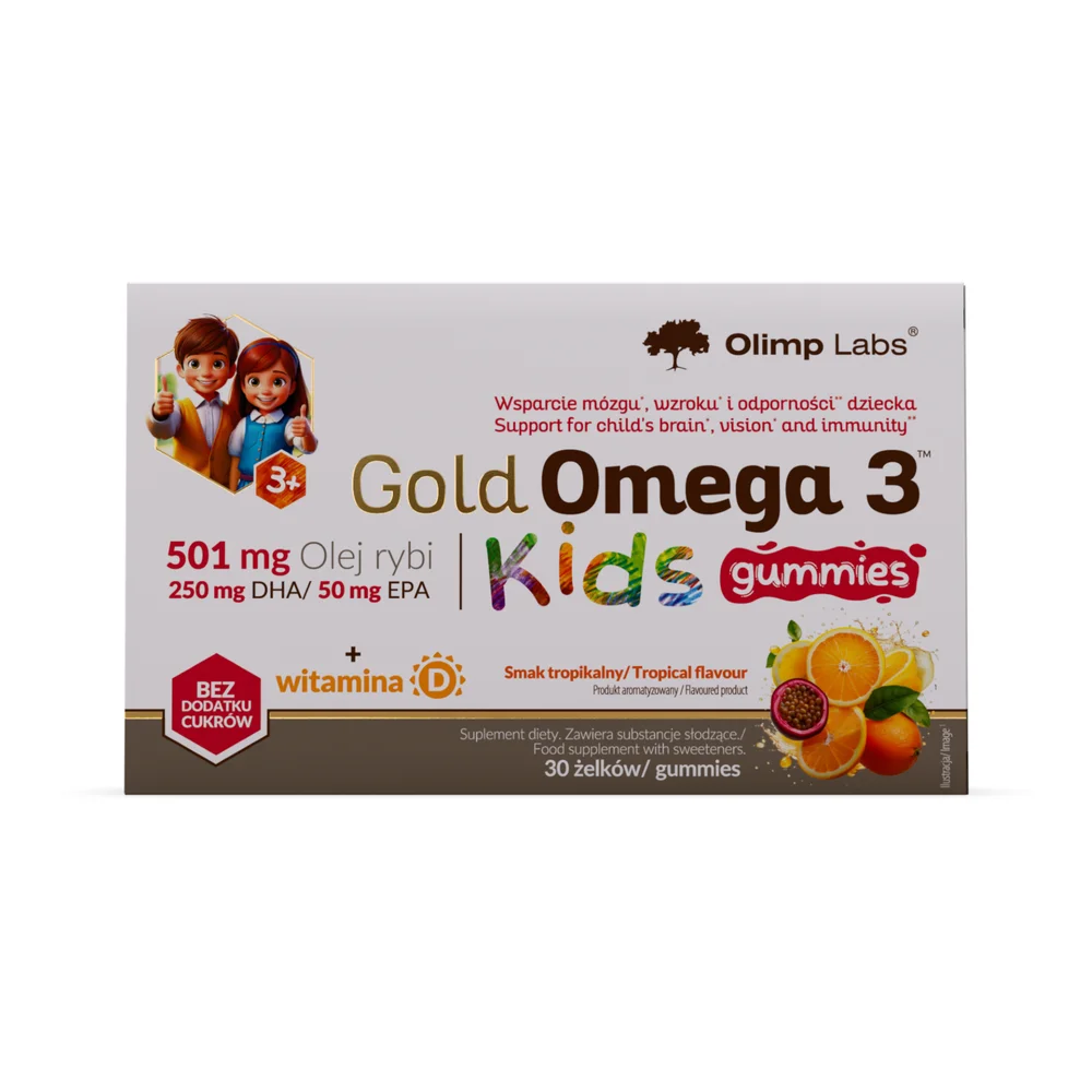 Gold Omega 3 Kids Gummies smak tropikalny to suplement diety w formie żelek, których składniki wspomagają rozwój i prawidłowe funkcjonowanie mózgu, wzroku oraz odporności u dzieci. Produkt przeznaczony dla osób dorosłych i dzieci od 3. roku życia.