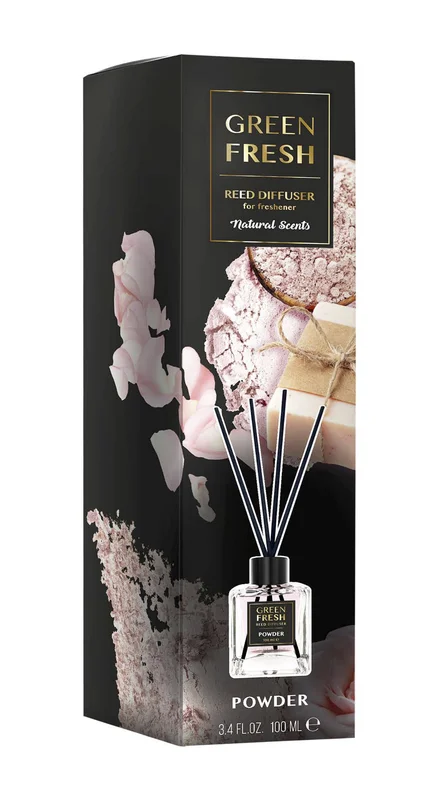 Green Fresh, Patyczki zapachowe Gold series Powder to produkt przeznaczony do aromatyzowania wnętrz. Zawiera mieszankę olejków zapachowych, umieszczonych w szklanym pojemniku. Patyczki, zanurzone w cieczy, służą do rozprzestrzeniania intensywnego zapachu w pomieszczeniach. Produkt idealny do użytku domowego oraz w biurach, odpowiedni do różnorodnych przestrzeni. Instrukcja użytkowania oraz informacje o składzie znajdują się na opakowaniu.Składniki/Ingredients