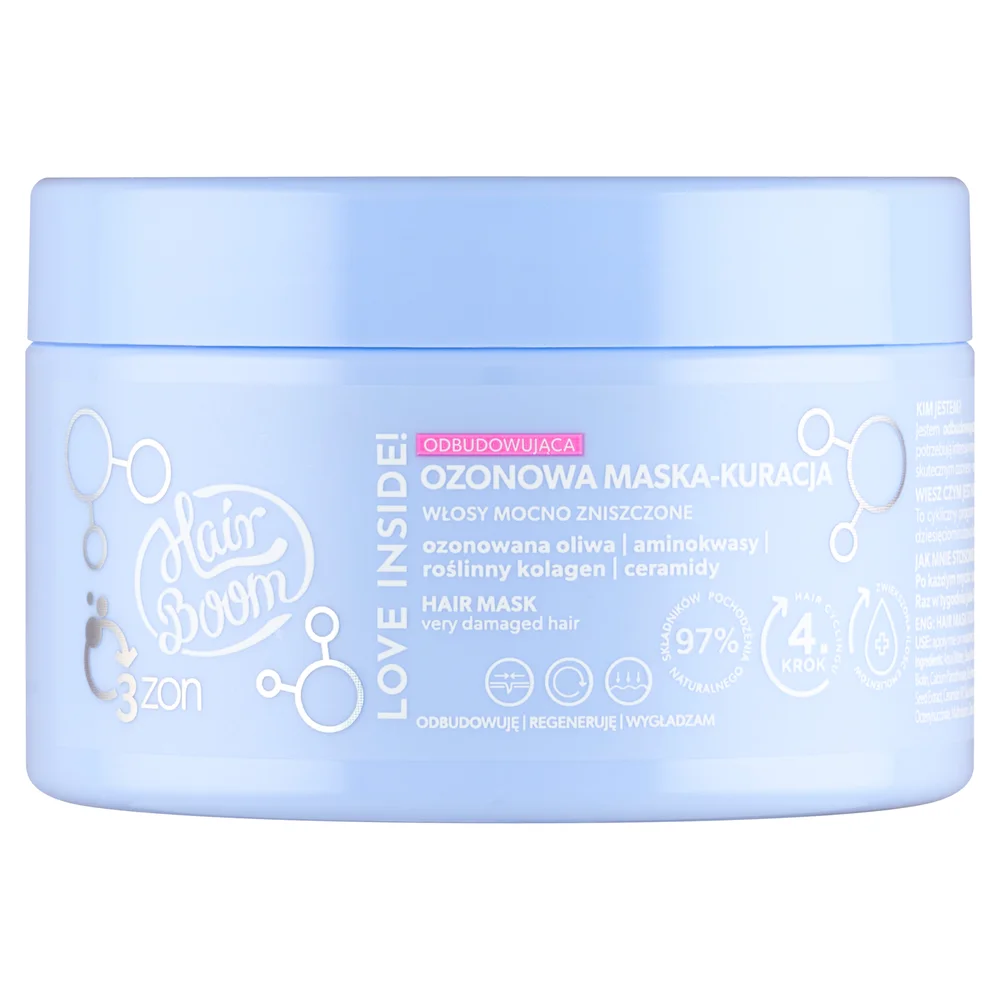 Hairboom O3zon Odbudowująca ozonowa maska-kuracja to produkt kosmetyczny stworzony dla włosów mocno zniszczonych, które potrzebują odbudowy i odżywienia. Sprawia, że włosy stają się mocniejsze, gładkie i pełne życia.